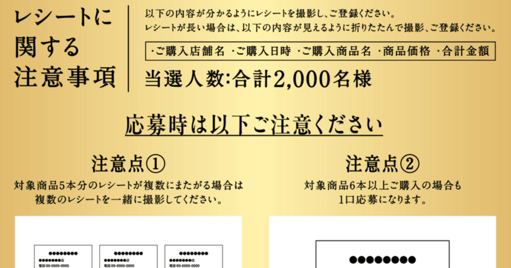 • 5本以上購入のレシートでも1枚につき1口の応募(10本買っても1口扱い)